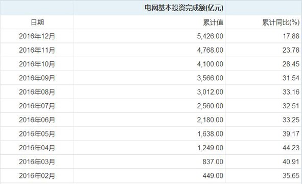 電網(wǎng)建設是我國能源轉型的基礎,周期長,規(guī)模大,難度高,為了盡快實現(xiàn)這個目標,近幾年我國在電網(wǎng)建設上逐步加大投資,石家莊電纜為大家統(tǒng)計出了較精確的數(shù)據(jù):我國2016年的電網(wǎng)投資約5426億元人民幣,同比增長17.88%。